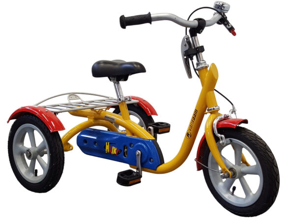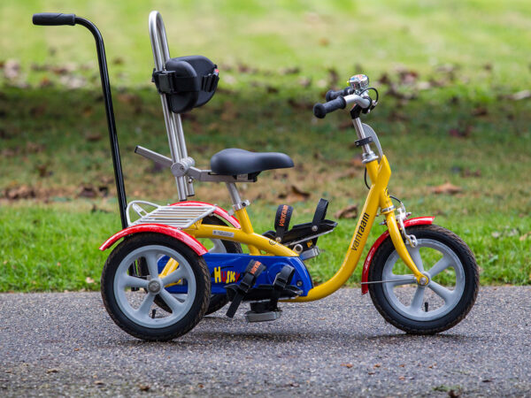 Triciclo con soporte inferior diseñado para pedalear hacia abajo sin dificultad gracias a su ligereza.